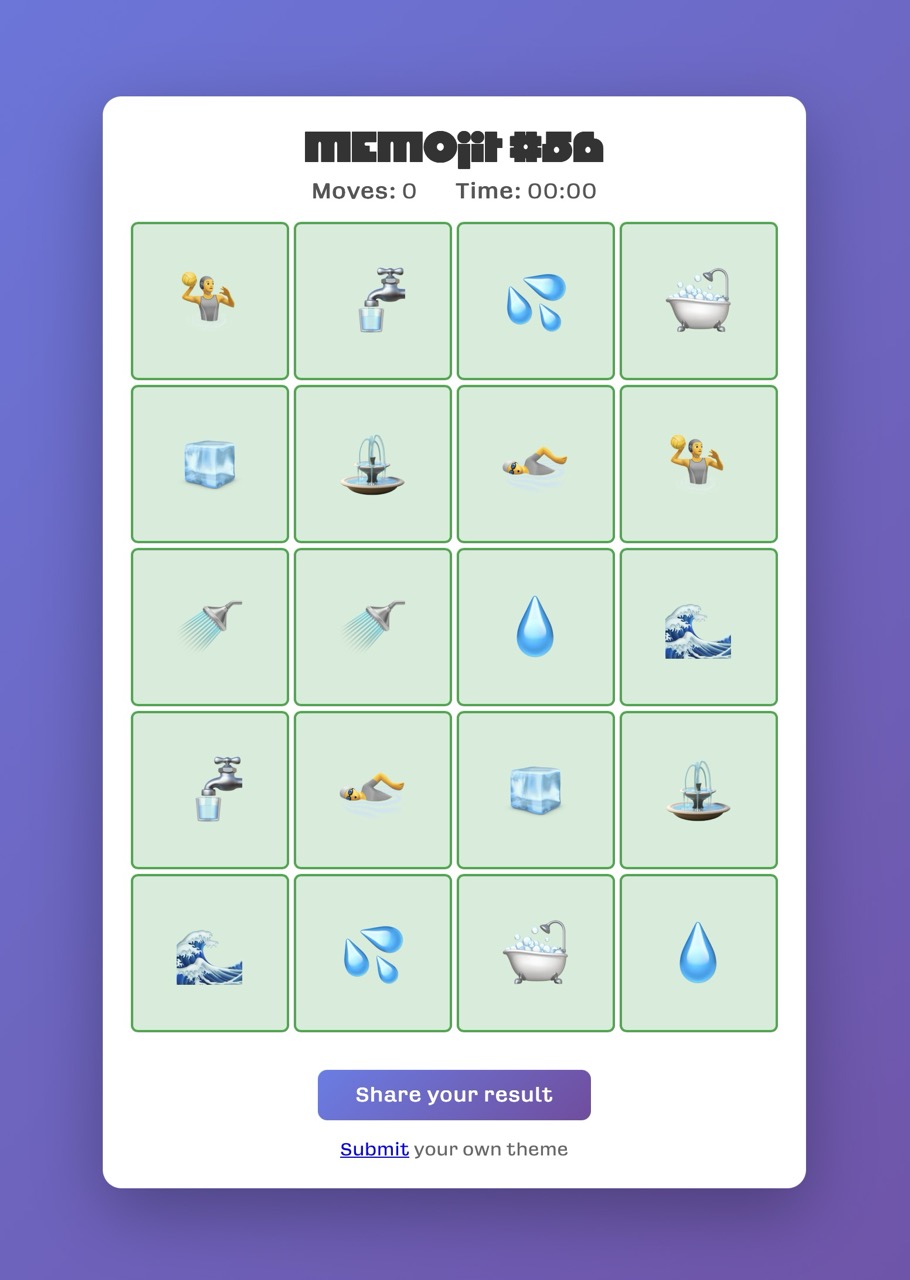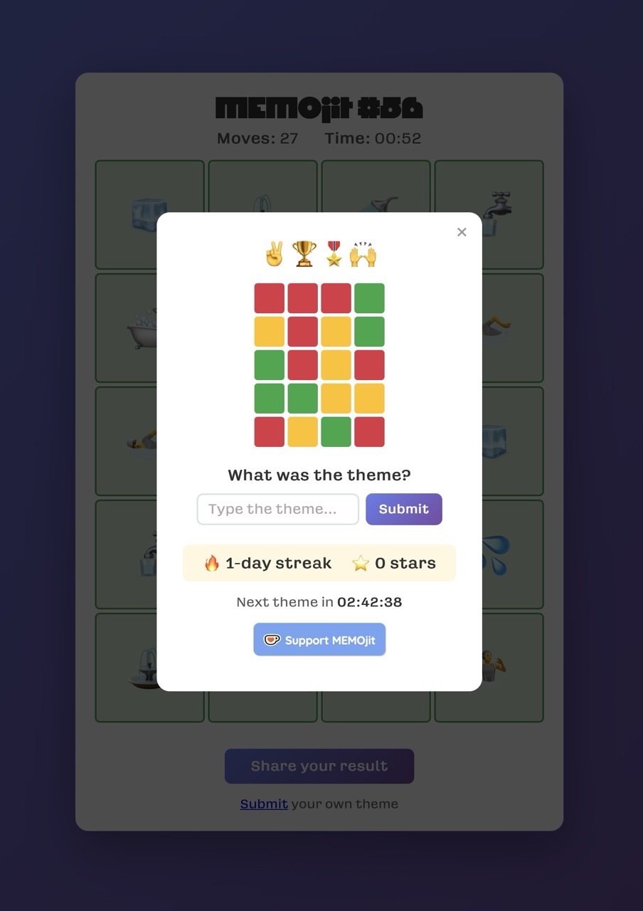 Designed and built a little daily game, à la Wordle, but to exercise one's memory. Players get to guess the theme of each day's puzzle for extra kicks. The gradients change every day, but the logo, made with Megazoid by David Jonathan Ross that gives the whole an arcade feel never changes.